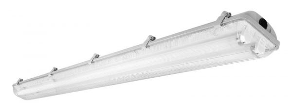 Šviestuvas skirtas 2x150cm T8 LED lempoms, atsparus drėgmei IP65, pilkas. Parduodamas be T8 lempų.