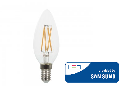 4W LED lemputė V-TAC, E14, žvakės formos, skaidriu stiklu, 3000K (šiltai balta), SAMSUNG LED chip