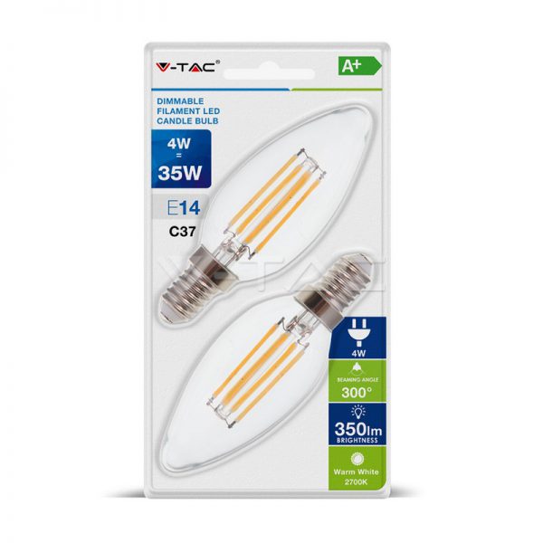 4Wx2vnt pakuotėje LED lemputės V-TAC, E14, A60, žvakės formos, dimeriuojama, 2700K (šiltai balta)