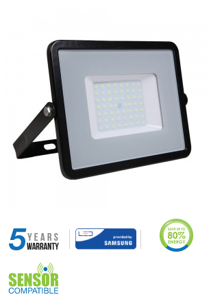 50W LED SLIM prožektorius V-TAC, 6400K (šaltai balta), IP65, juodu korpusu, SAMSUNG LED chip