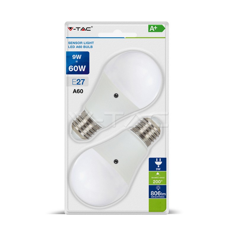 9Wx2vnt/pakuotėje LED lemputės V-TAC, A60, E27, su sensoriumi, 6400K (šaltai balta)